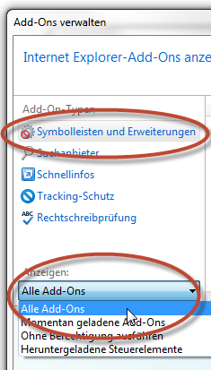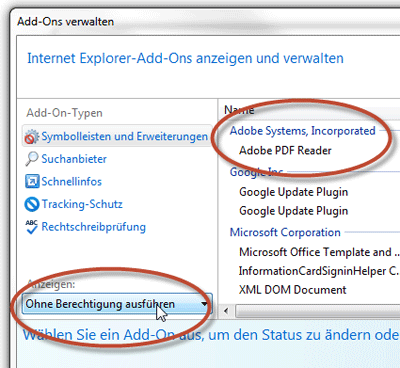 HINWEIS: Wenn das Add-On "Adobe PDF Reader" nicht angezeigt wird, versuchen Sie es mit den anderen Einstellungen im Menü "Anzeigen". Bei manchen Systemen wird das Add-On zum Beispiel angezeigt, wenn dort "Ohne Berechtigung ausführen" ausgewählt ist: