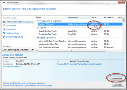 Wenn Adobe Reader installiert ist und Sie dennoch keine PDF-Dokumente im Internet Explorer öffnen können, ist möglicherweise die Verwendung von Adobe Reader deaktiviert.